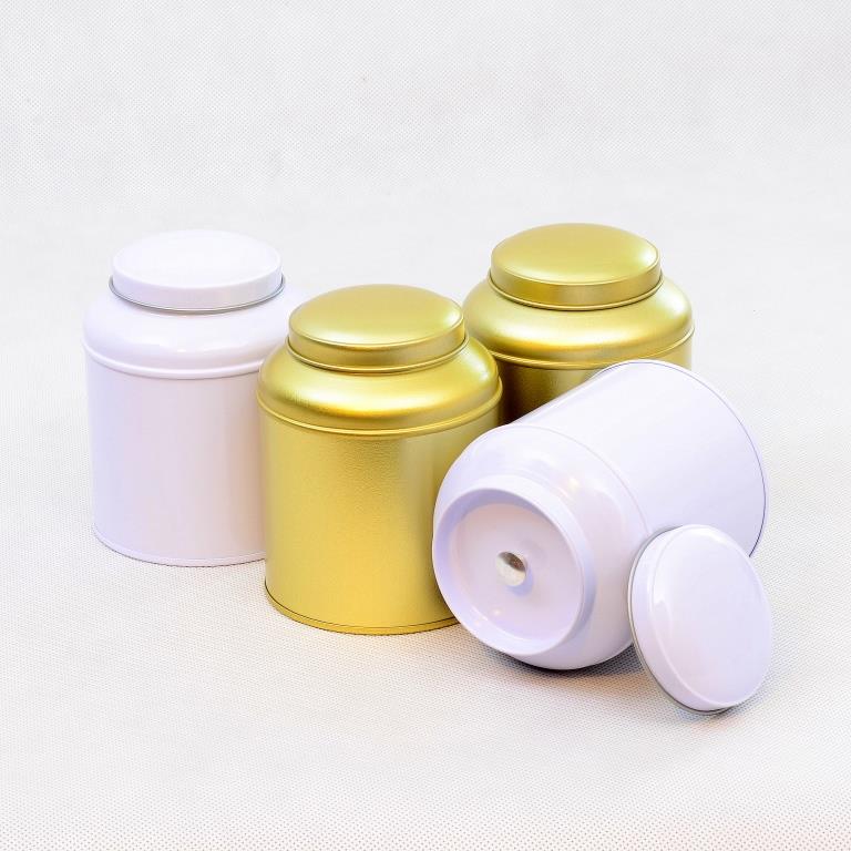 Owalna, metalowa puszka w kolorze białym o pojemności 100 g.