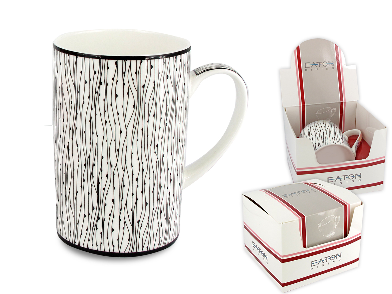 Porcelanowy kubek z biało-czarnym motywem o pojemności 350 ml. Kubek zapakowany jest w kolorowy kartonik.