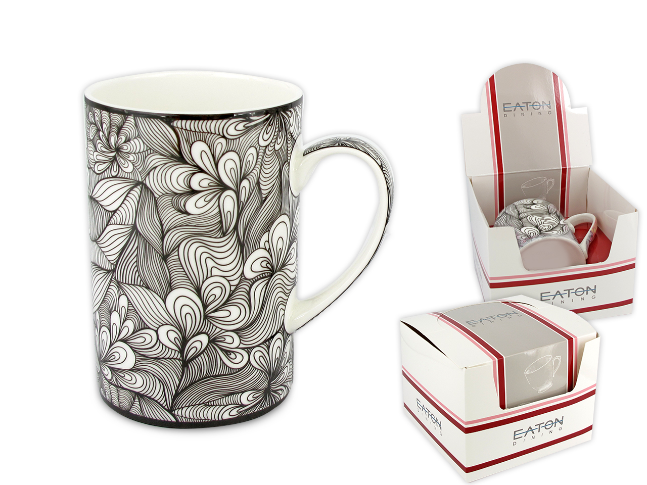 Porcelanowy kubek z biało-czarnym motywem o pojemności 350 ml. Kubek zapakowany jest w kolorowy kartonik.