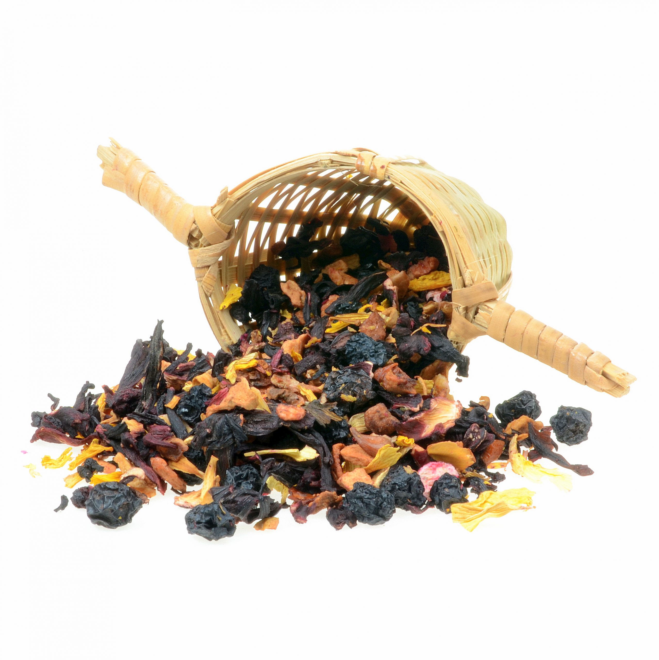 - Wygląd mieszanki: wizualne arcydzieło pełne ciemnych owoców, całych pączków róż i kontrastujących, żółtych płatków kwiatów.
