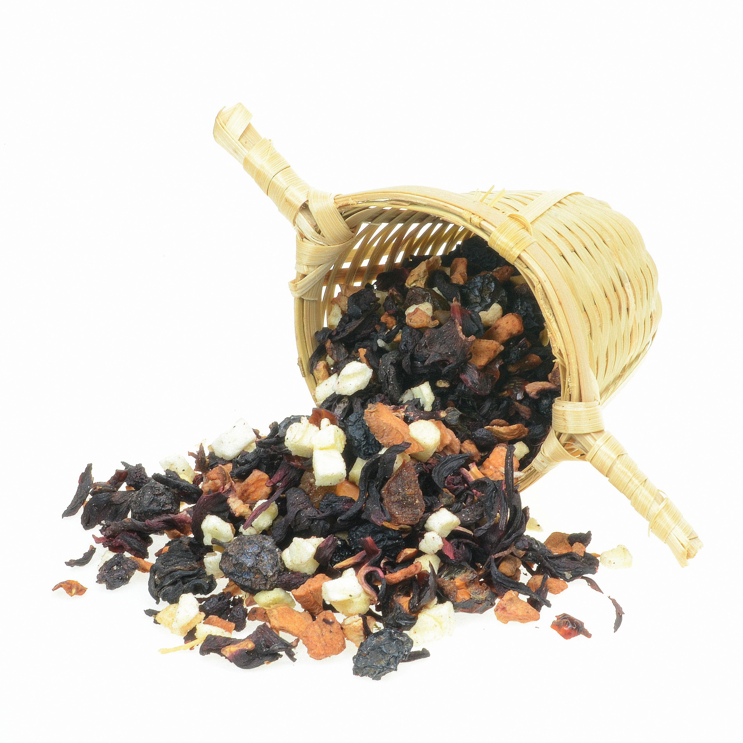 Składniki: owoce suszone 85% (jabłko, aronia, róża, tarnina, śliwka, bez, porzeczka, rodzynki [rodzynki, olej słonecznikowy] i wiśnia), hibiskus, cynamon grys 5%, liofilizowane jabłko 4,5%, aromaty.