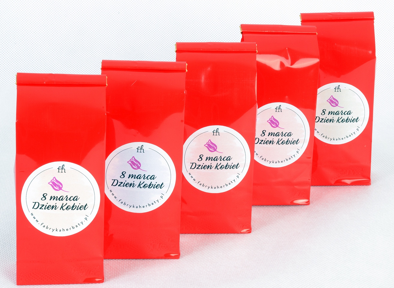 Dowolna herbata smakowa czarna, smakowa zielona lub owocowa w torebce koloru czerwonego z wybraną etykietą Dzień Kobiet. Gramatura herbaty 50 g. Cena brutto za jedną herbatę. W komentarzu do zamówienia wpisz: nazwę herbaty oraz kolor etykiety..