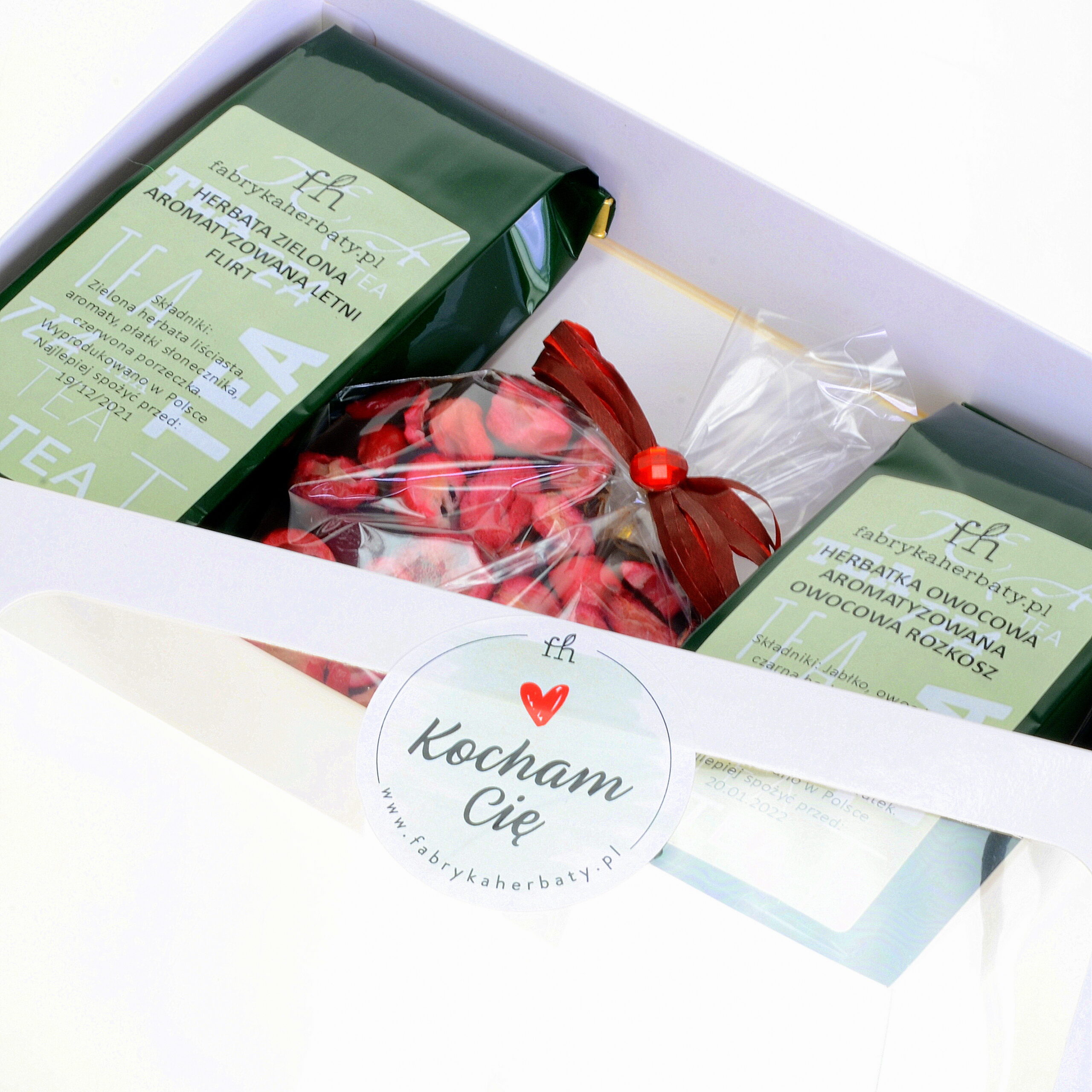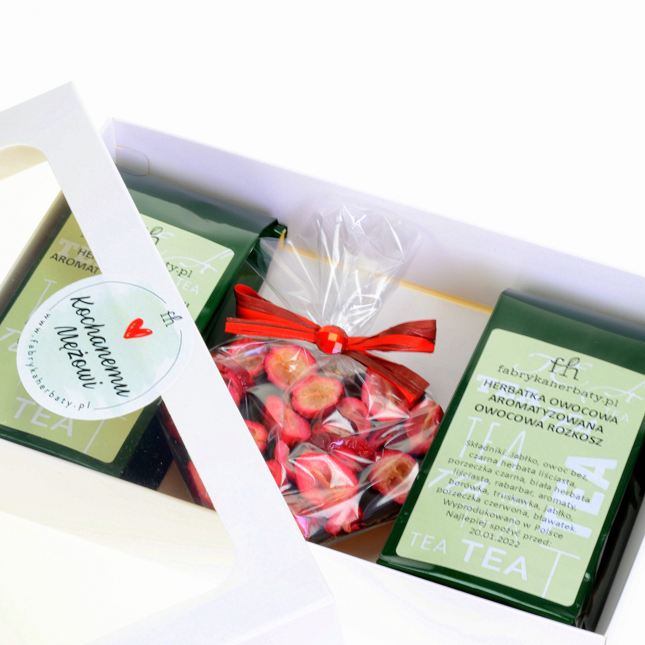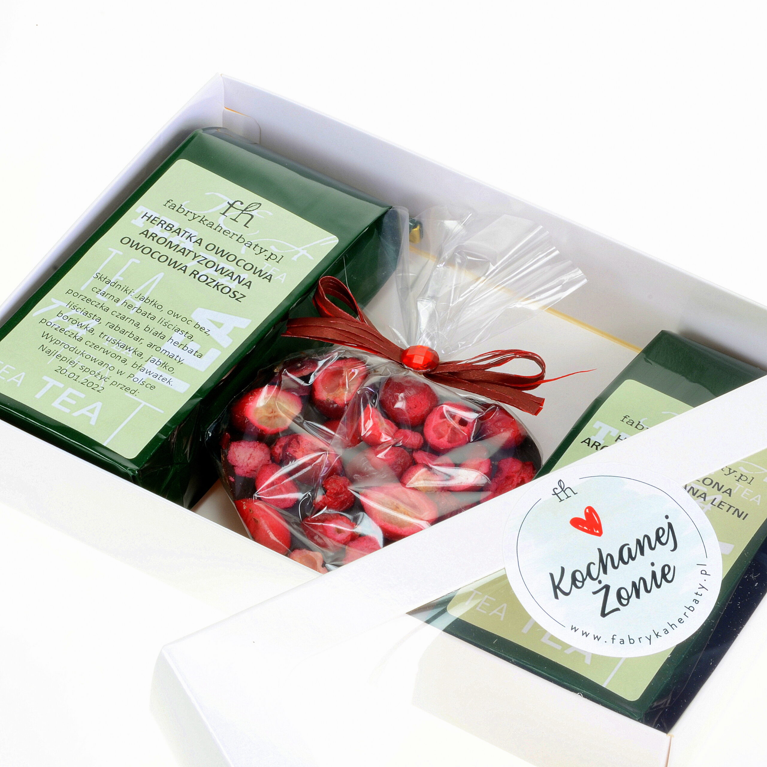 Delikatna zielona herbata Letni Flirt, herbatka Owocowa Rozkosz oraz ręcznie robione serce z czekolady z żurawiną zaprezentowane w białym pudełku tworzą nie tylko dobrze dobraną smakowo kompozycję walentynkową, ale także mogą być doskonałą propozycją upominku dla bliskiej osoby na inne okazje. Do wyboru są trzy warianty opakowania z naklejką Kocham Cię, Kochanej Żonie lub Kochanemu Mężowi.