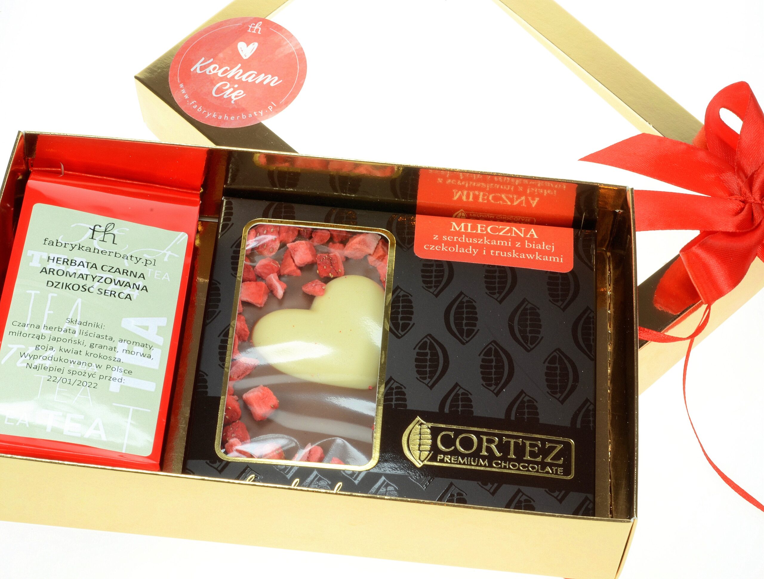Herbata Amorek lub Dzikość Serca oraz pyszna, ręcznie robiona mleczna czekolada z sercem z białej czekolady, obsypana truskawkami, zapakowane w eleganckie złote pudełko z kokardką, to jedna z naszych propozycji na wyjątkowy upominek dla bliskiej osoby. Cukrowe serduszka w herbacie oraz dedykowana naklejka (Kocham Cię, Kochanej Żonie, Kochanemu Mężowi) znajdująca się na wieczku są idealnym uzupełnieniem tego zestawu.
